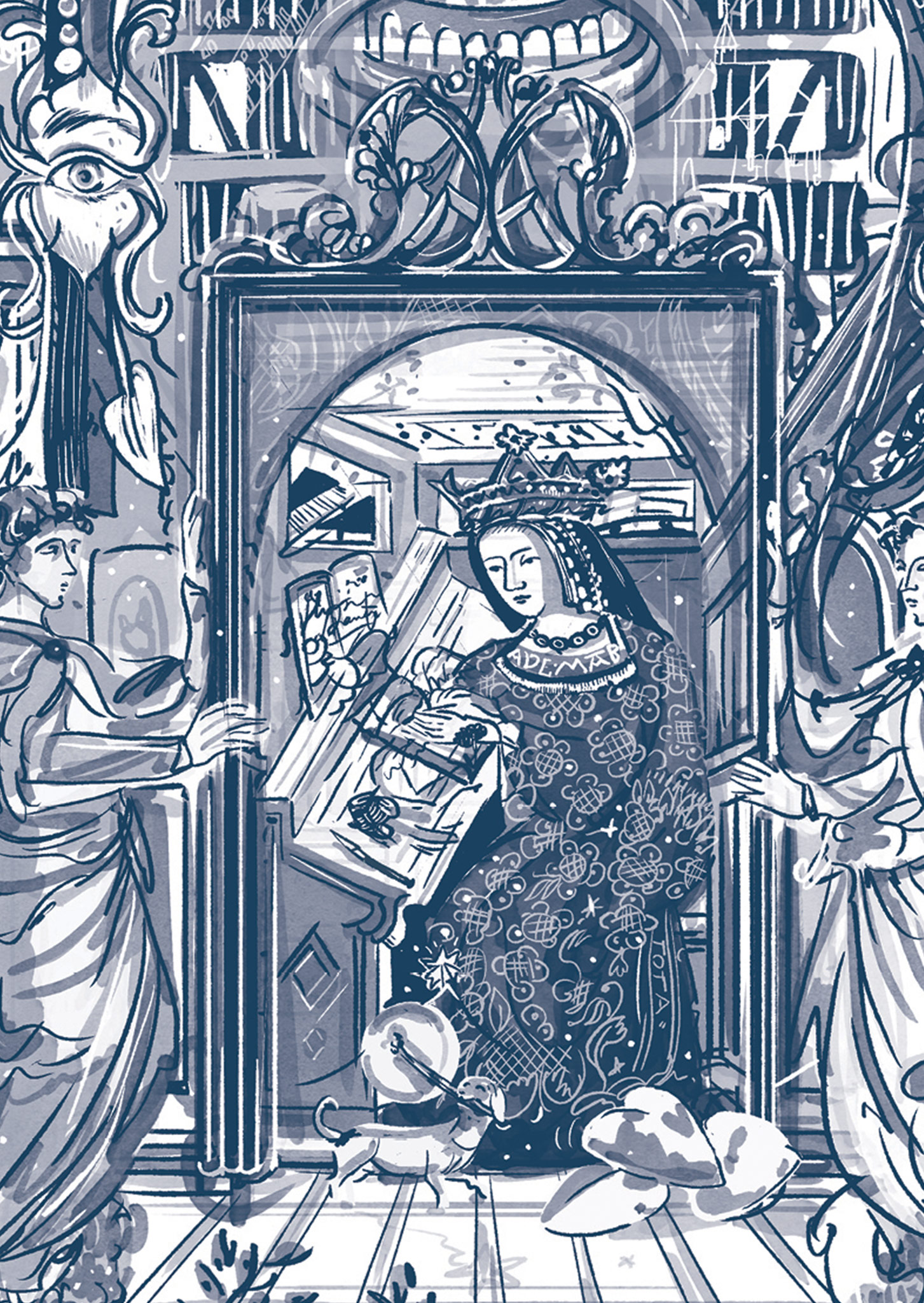 Puis au coeur du cadre, coexistent une image clé, une pièce unique, un trésor d’archives, une Anne de Bretagne qui a pris la place ou les traits d’un Dante ou d’un moine copiste travaillant depuis son lutrin (pour mieux comprendre mon propos, veuillez vous référer à l’image ci-dessous). Puis de cette image mise en abîme se lie(t) alors une autre histoire, celle reliée à la Ville de Rennes et ça Notre Dame c’est une bonne Nouvelle !
